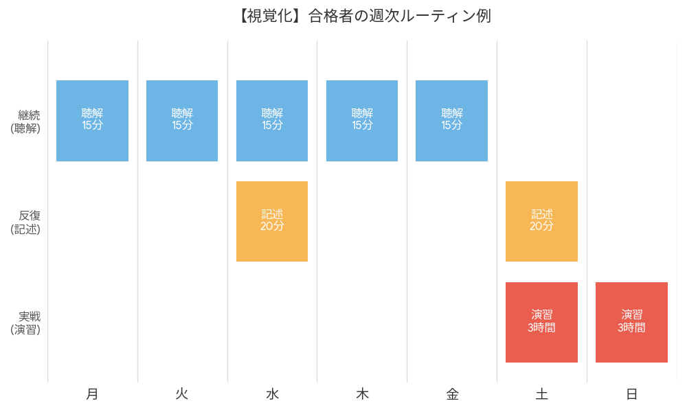 | 月〜金 | 聴解(15分) | 通勤中に音声を聴き、口腔断面図やアクセントに耳を慣らす。 |