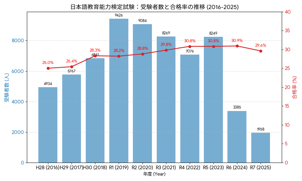 2024年(令和6年)以降の受験者数減少は、国家資格「登録日本語教員」制度の開始に伴う移行期の影響です。